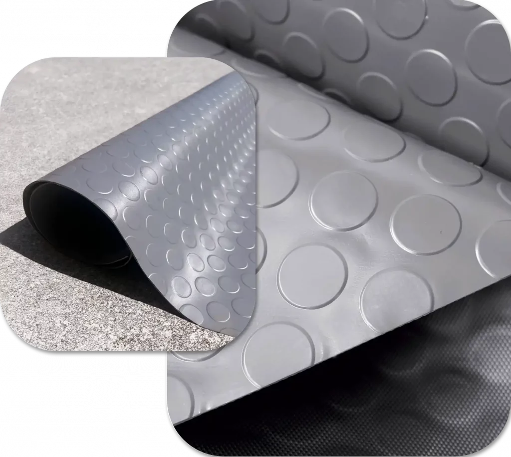The choice of two textures-bubbles or embossed sheet metal-enhances the non-slip effect, making it perfect not only as flooring for workshops, warehouses, and laboratories, but also as a non-slip bottom for shelves or worktops. The unalterable PVC material, resistant to liquids and external agents, makes it ideal for professional environments where quick cleaning and long life are required.