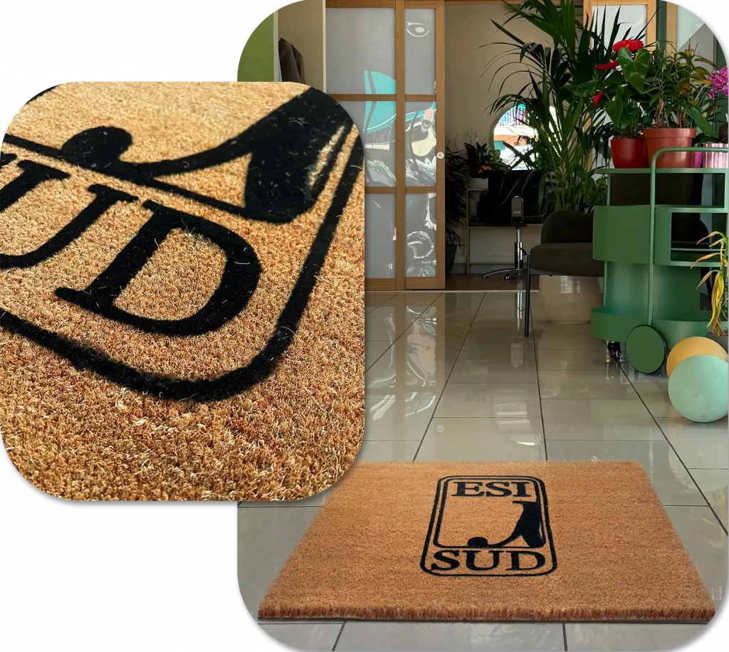 La stampa floccata in rilievo dona un effetto velluto elegante, trasformando il tappeto in un elemento di design e comunicazione visiva. Personalizzabile in forma e grafica, questo zerbino con logo in cocco floccato si adatta con precisione a uffici, spazi pubblici e attività commerciali.